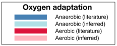 图1 细菌对氧气适应的演化历程。细菌系统发育树(基于1007 个基因组的65 个标记基因),分支颜色表示预测的氧适应能力(红色:有氧;蓝色:厌氧)。外圈显示现存基因组的观测(深色)或预测(浅色)氧适应表型