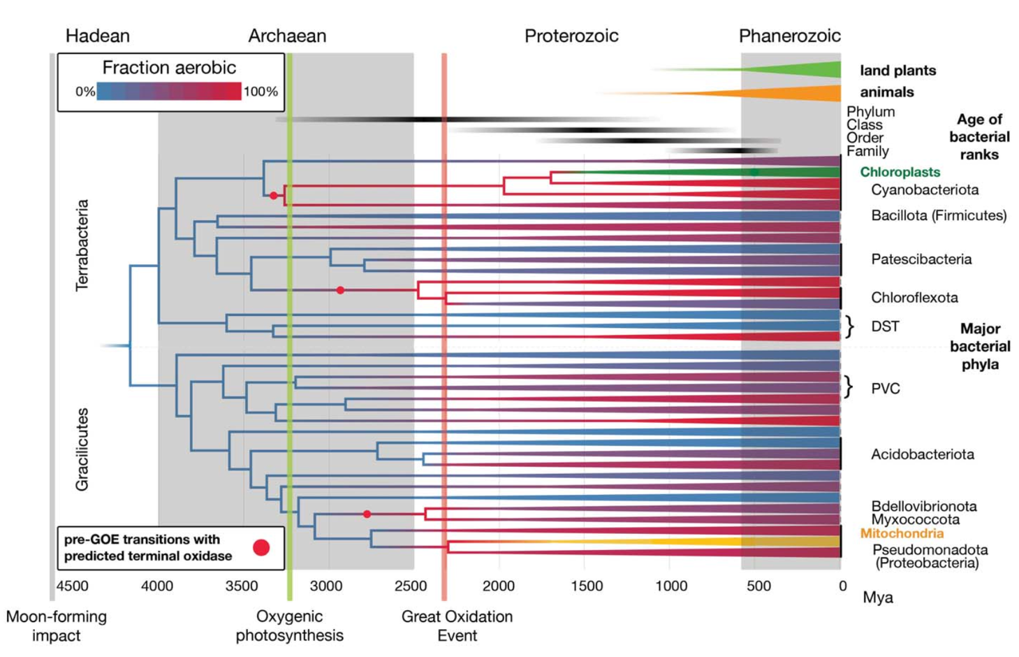 为回答这一关键问题,近日,来自澳大利亚昆士兰大学、匈牙利厄特沃什·罗兰大学、日本东京大学等十几家机构的研究团队合作在Science发表了一项具有里程碑意义的研究成果(Davín et al., 2025)。该研究整合了细菌基因组数据、机器学习预测、系统发育协调分析和分子钟定年方法,系统探究了地球早期细菌从厌氧到有氧代谢生活方式的转变。通过将GOE与细菌有氧谱系的出现时间相关联,并引入多项新的最大年龄校准约束,在细菌系统发育树上精确映射了从厌氧到有氧生活方式的演化。这项工作首次构建了细菌演化与氧适应的地质时间框架,为理解生命演化与地球氧化历史之间的耦合关联提供了关键证据。