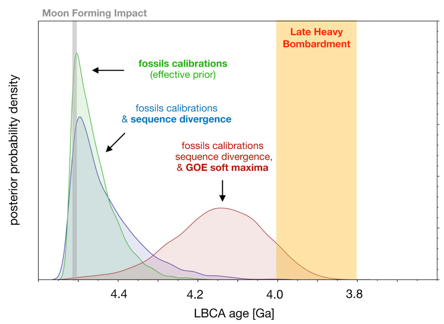 图3 不同分析条件下推断的细菌最后共同祖先(LBCA)年龄。LBCA 的推断年龄相对于月球形成大撞击事件(MFI)以及晚期重轰炸期(LBH)的时间关系。仅基于系统树拓扑结构和定年校准信息(以MFI设定LBCA根节点最大年龄的有效先验,绿色)时,概率主要集中在约45.2 亿年前。加入序列数据后,LBCA 年龄整体偏向更年轻,但仍紧邻MFI时间边界(蓝色)。在此基础上引入GOE软最大年龄约束(红色),进一步减弱了仅由拓扑和校准所导致的过早年龄估计