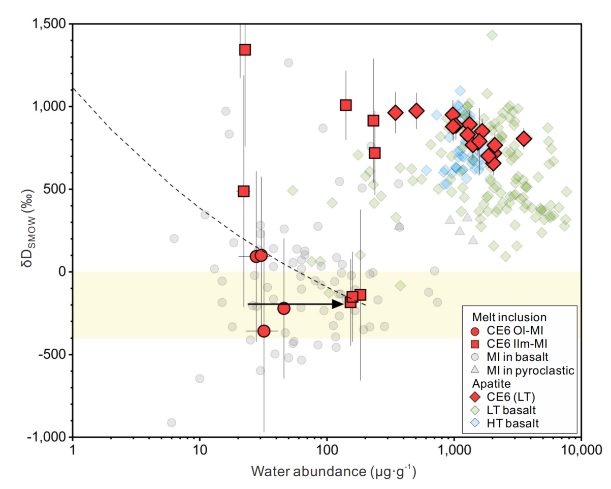 图3 嫦娥六号玄武岩样品熔体包裹体和磷灰石的水含量及氢同位素组成。橄榄石中熔体包裹体具有最低的水含量和最轻的氢同位素组成。钛铁矿中的熔体包裹体水含量和氢同位素组成变化范围较大。磷灰石具有结构水故而具有相对高的水含量,对应有最重的氢同位素组成