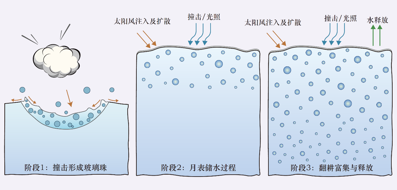 图2 撞击玻璃珠参与月表水循环模式图。Stage 1: 撞击玻璃珠的形成,该过程伴随着强烈的冲击,形成的玻璃珠均匀干净,几乎失去了其所有的挥发性成分。Stage 2: 太阳风质子注入颗粒表面形成水合分子,而后水向玻璃珠内部扩散。Stage 3: 携带水的玻璃珠在月表“翻耕”作用下向月壤深处转移,形成月壤中的“水库”。表层新形成的玻璃珠继续接受太阳风成因水的扩散,同时在温度升高的条件下(光照或陨石撞击),水被释放到月球外逸层