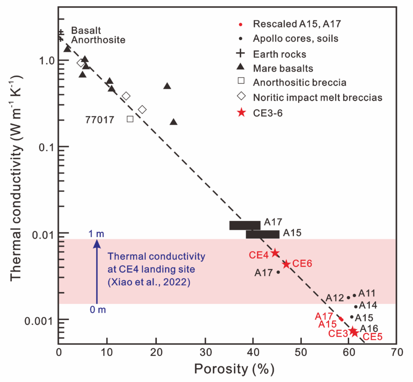作为月球最外层的结构,月壳对月球内部热量的传导作用类似于热毯效应,其物性的横向和垂向差异可显著影响月球不同区域的冷却效率。通过测量不同采样点区域的孔隙度与热导率,可建立两者的经验关系,然后将嫦娥6号的孔隙度测量结果应用于这一经验关系,发现南极-艾肯盆地的热导率较月球近侧风暴洋区域的热导率高一个数量级(图4)。该结果与嫦娥4号轨道器观测的结果相近,这说明相较于南极-艾肯盆地,月球的近侧可以保持更长时间的内部热量,从而导致更慢的冷却速度和更长期的火山活动(图5)。此外,南极-艾肯盆地低孔隙度引起的热损失增强可能加速了该地区岩石圈的增厚,与近侧风暴洋区域相比,进一步促进了该地区火山活动的减弱。这些月球不同区域的差异冷却模型为未来的热流测量提供了预测,并可能解释月球不同区域的火山爆发的不同持续时间。