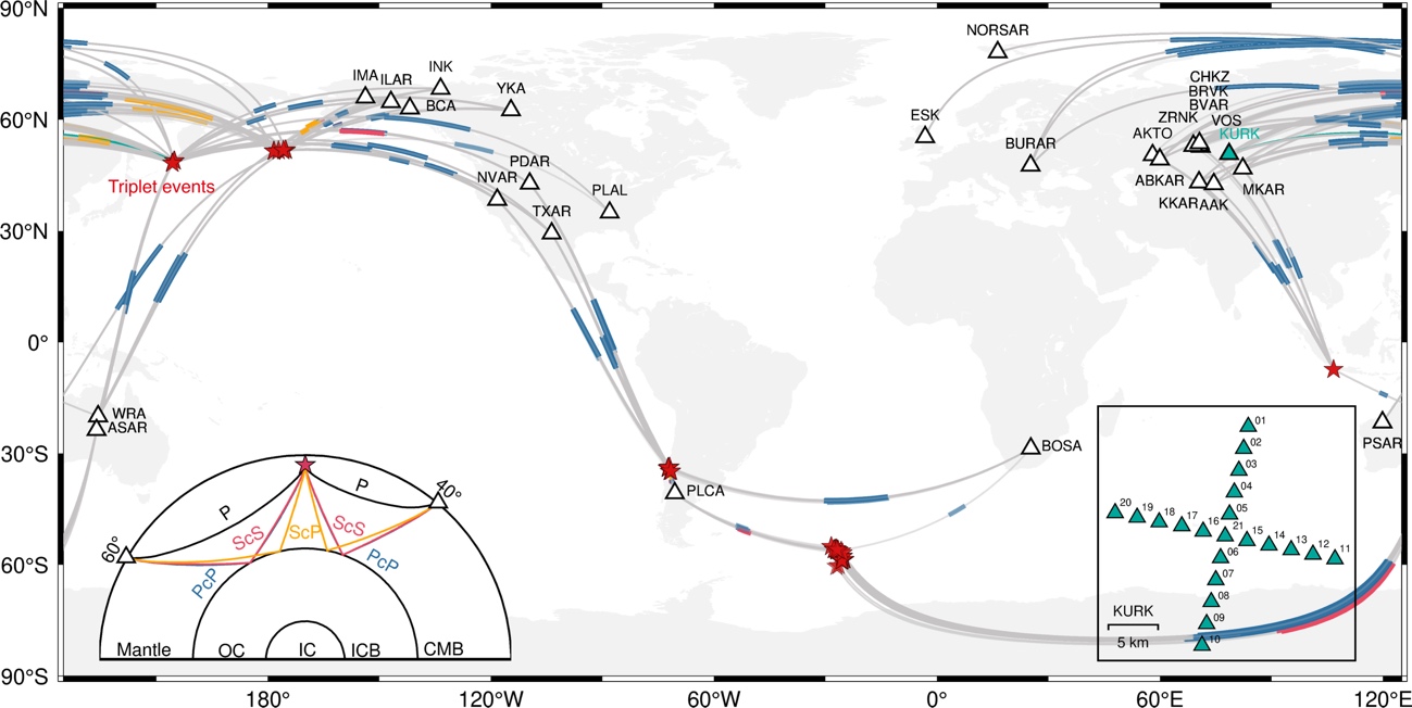 针对这一问题,中国科学院地质与地球物理研究所行星科学与前沿技术重点实验室崔天宇博士后与王巍特聘研究员、合作导师艾印双研究员及其他合作者共同开展研究,基于前人构建的全球重复地震目录(Yang and Song, 2023),系统分析了全球尺度CMB非均匀结构及其地形潜在时变特征。该研究系统收集了全球中-小孔径台阵记录到的重复地震的前临界核反射震相(PcP、ScP和ScS),最终筛选出含1320对PcP、82对ScS以及22对ScP波形对的高质量研究数据集。该数据集覆盖广泛的震中距范围,空间上分布于欧亚大陆北部、环太平洋地区、南极及东南亚等地区(图1),重复地震对的时间间隔从数年至二十余年不等,为约束CMB潜在的时间变化提供了可靠的数据观测基础。研究团队对上述核反射震相的波形相似性及振幅相对变化进行了系统分析,并进一步对直达P波和S波开展对比研究,以评估震源复杂性、浅部结构非均匀性及背景噪声对观测结果的潜在影响。