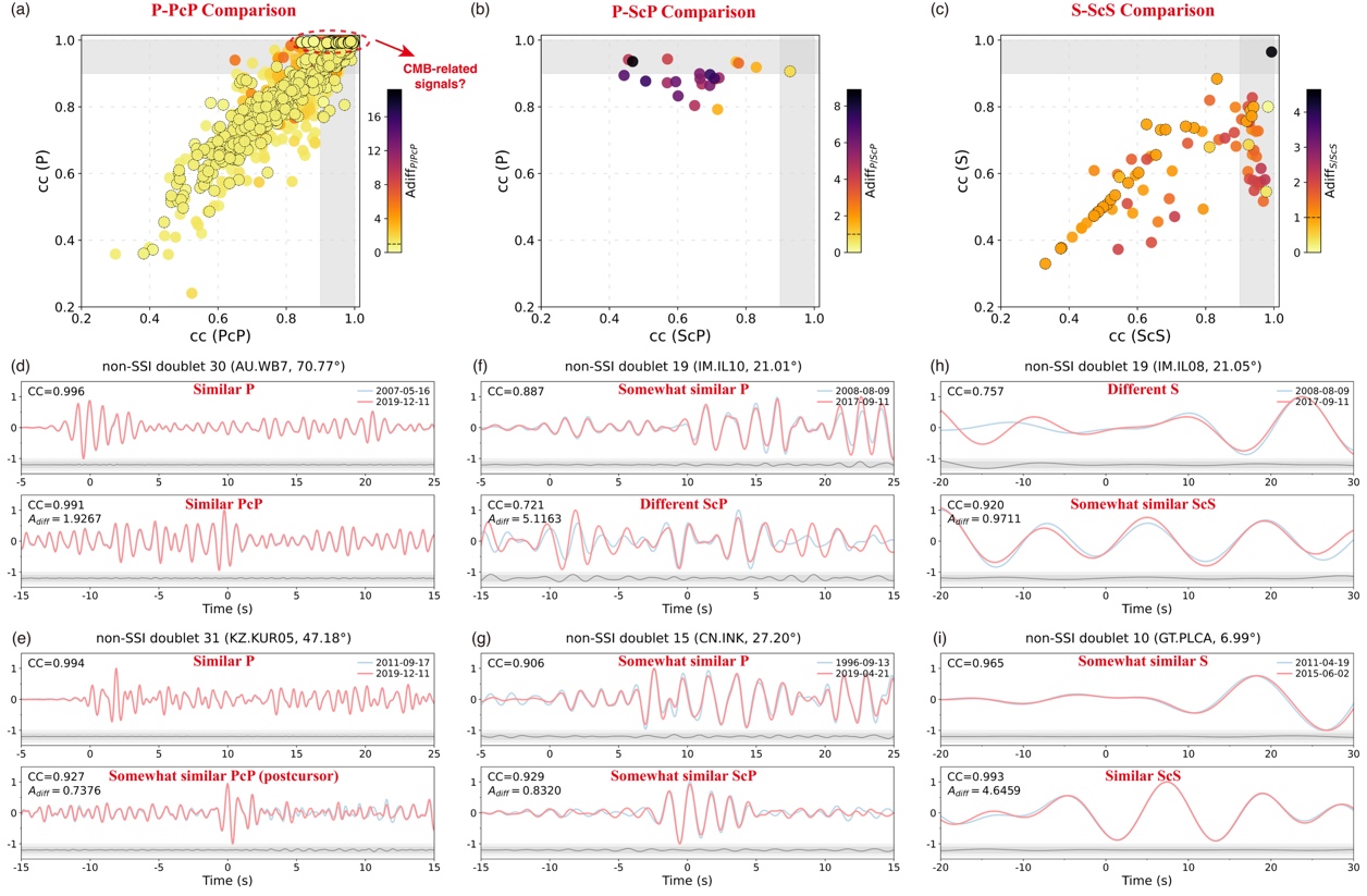0.99的数据以实线边框标示,红色虚线圈出最可能反映CMB时变信号的样例。(d–i)为不同相似性组合下的归一化波形对比图。蓝色与红色分别代表重复地震对中的早期与后期事件,灰色曲线为两条波形之差