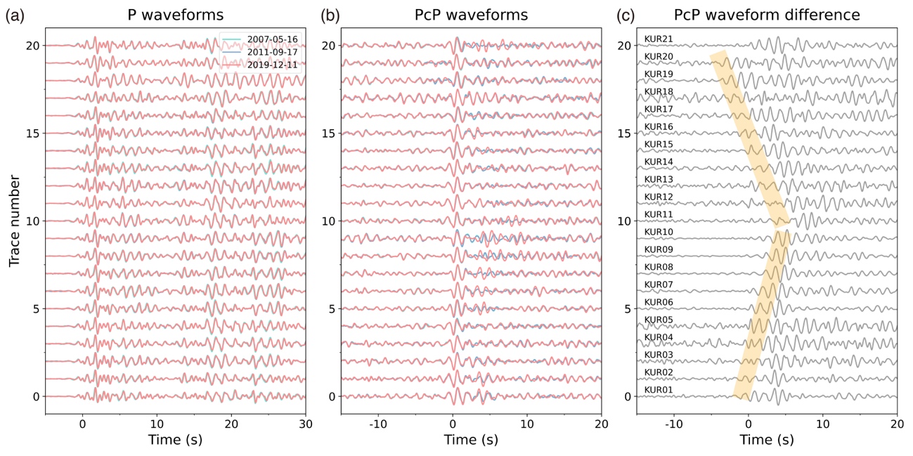 图3 KURK台阵记录的三次重复地震P与PcP波形对比。(a)三次事件的直达P波高度相似;(b)2019年事件的PcP前、后至波出现明显异常,与前两次事件不同;(c)2019年事件与前两次的波形差异在小孔径台阵不同台站间表现为最大约10 s的到时差(橙色阴影)
