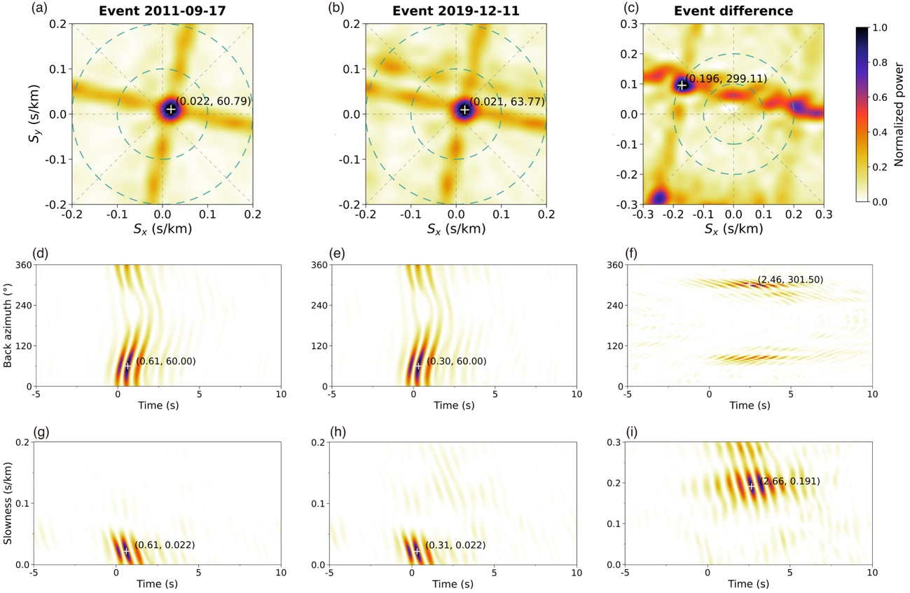 图4 重复地震fk与速度谱分析中慢度与反方位角结果。(a)2011年地震事件的观测fk归一化功率谱,白色十字标示主到达波的水平慢度和反方位角;(b)同(a),为2019年事件;(c)两次事件fk功率谱之差。(d–f)分别为2011年、2019年及其差值的反方位角速度谱;(g–i)为对应的慢度速度谱