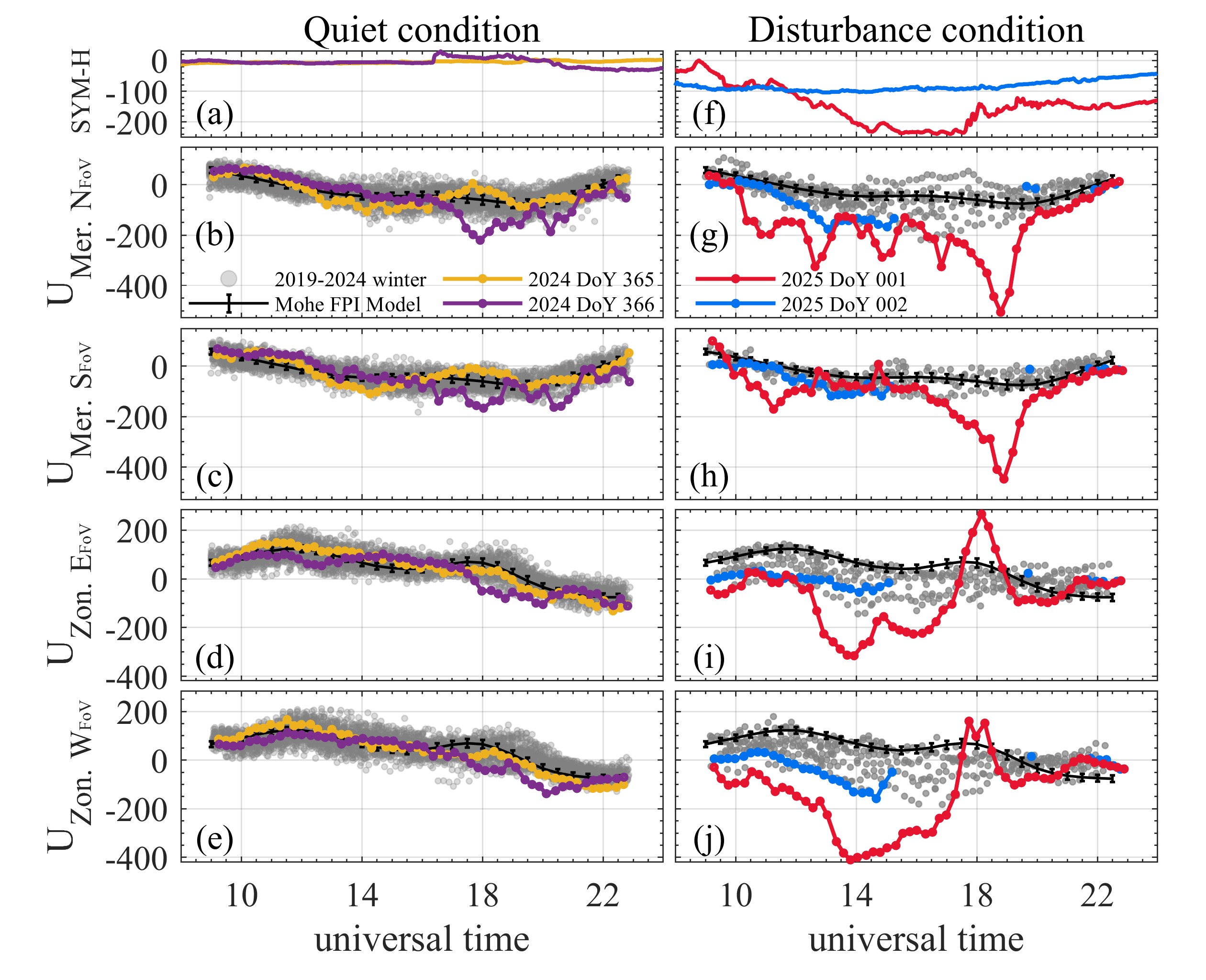 图2 2024年12月30日至2025年1月2日期间漠河的高层大气风场。自上而下分别为SYM-H(nT)指数以及北、南、东、西四个漠河FPI观测视场方向上的风速(m/s)。带误差棒的黑线表示基于漠河FPI历史观测资料建立的风场气候学模型。灰色散点表示2019年至2024年间每年DOY300至次年DOY 60时段内的漠河FPI观测结果。其他不同颜色的虚线表示2025年“新年”磁暴期间不同日期的SYM-H和风场变化