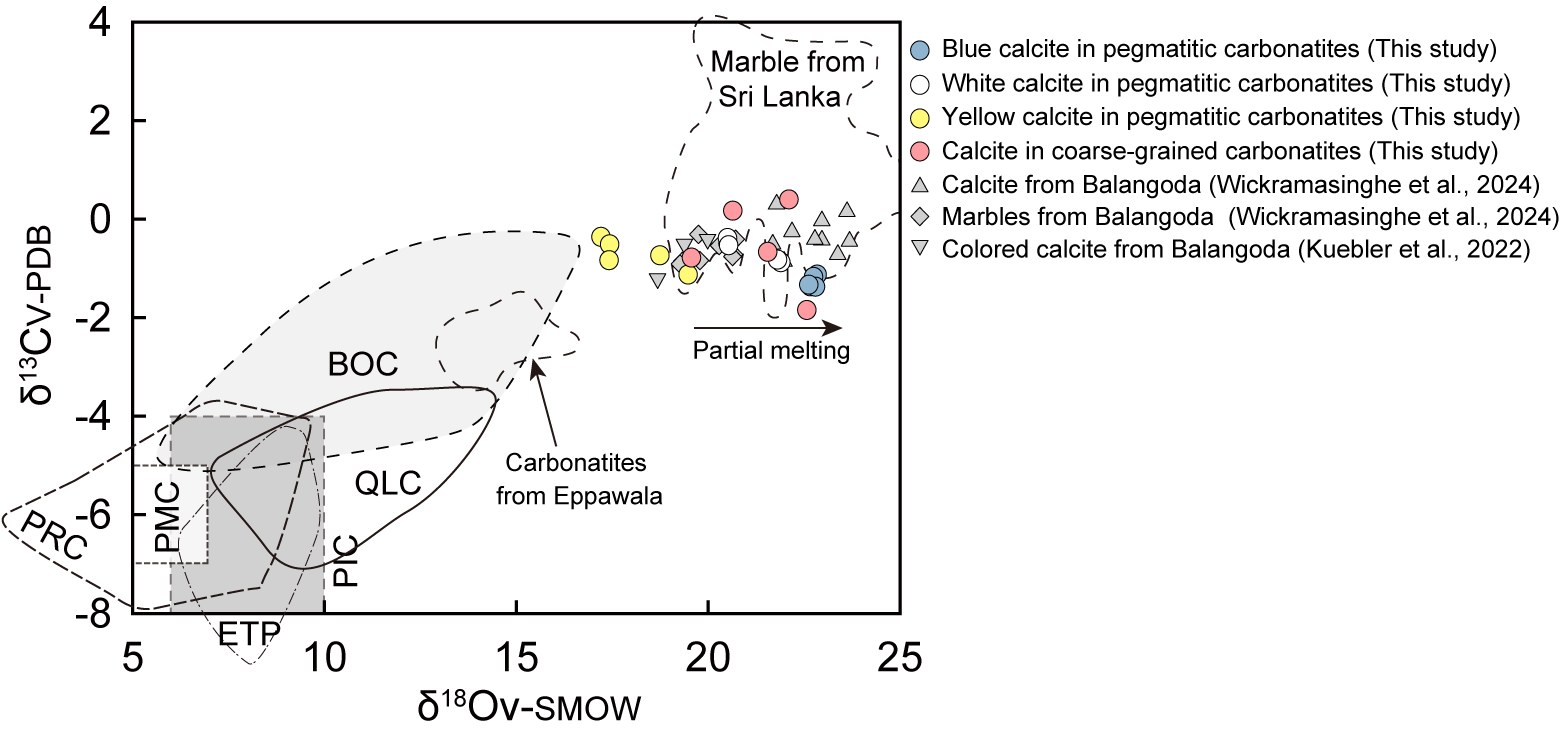 图2 斯里兰卡Balangoda碳酸岩中方解石的C-O同位素组成