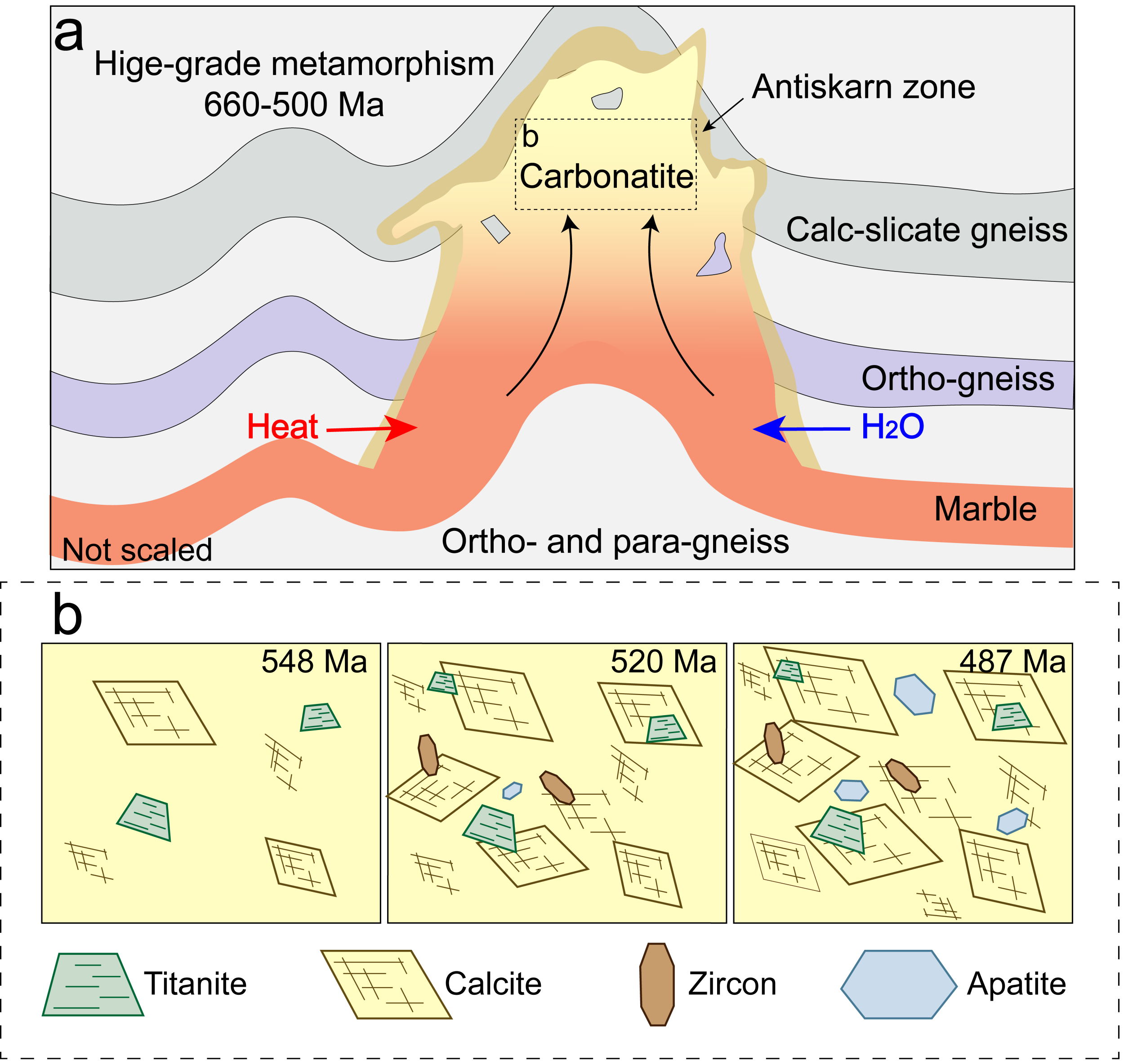 近年来,全球已发现22处壳源碳酸岩,其成因备受学界关注。这些碳酸岩多分布于造山带,形成时代从元古代延续至新生代,成分以钙质为主,具有较弱的轻重稀土分异,以及显著的Eu、Nb、Ta、Zr、Hf负异常与Pb、Sr正异常。其Sr‑Nd同位素组成介于球粒陨石与大陆地壳演化线之间,C‑O同位素则介于原生碳酸岩浆与沉积碳酸盐岩之间。目前主要的成因模式包括中酸性侵入体或基性岩浆热流诱发碳酸盐岩熔融、强烈区域变质导致的碳酸盐岩部分熔融以及大理岩深熔作用。然而,壳源碳酸岩的漫长演化过程及其与区域变质或构造事件之间的耦合关系,缺乏年代学约束。