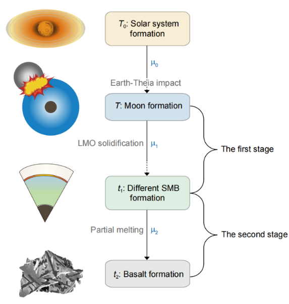 在这一情景下,不同月海玄武岩源区均是岩浆洋阶段演化而来,且具有相同的初始 Pb 同位素组成(PbSMB)。这一初始 Pb 同位素组成不仅记录了从月球形成到月海玄武岩源区形成这一阶段放射成因 Pb 的累积(图1第一阶段),同时也是后续月海玄武岩源区继续演化的起点(图1第二阶段)。因此,通过对玄武岩源区形成时 Pb比值的计算,可以建立月海玄武岩样品与月球早期演化之间的联系,进而利用玄武岩样品的 Pb 同位素数据反演月球的形成时间。