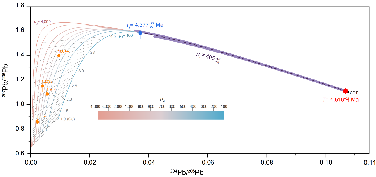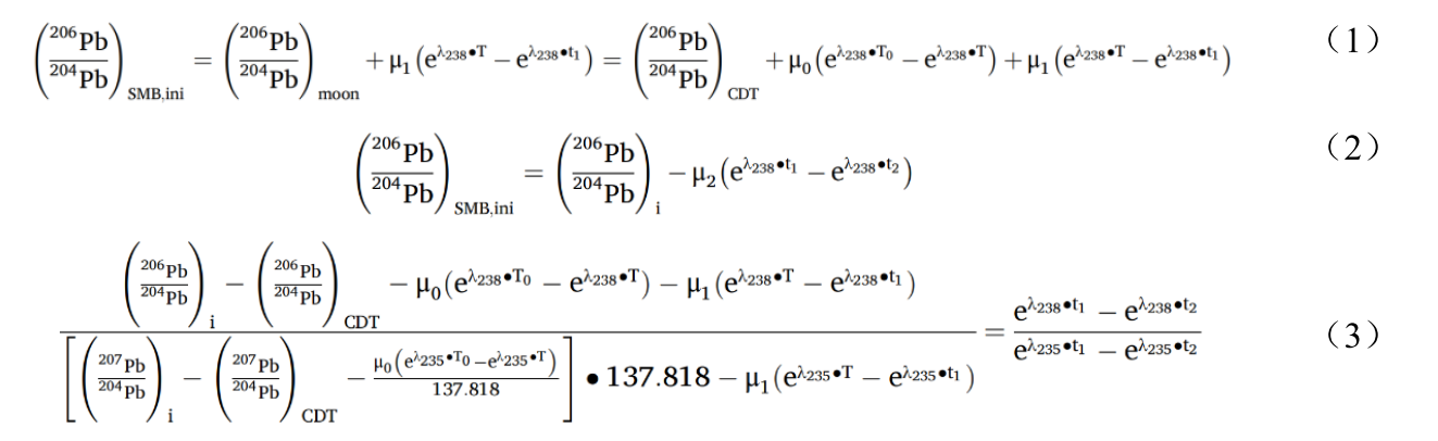公式(1)描述了第一阶段 238U-206Pb 同位素体系的演化过程,公式(2)描述了第二阶段演化过程。同理可以写出235U-207Pb同位素体系的演化过程。因为两个体系具有相同的源区U/Pb比值(µ2),将µ2消去后两个同位素体系的方程联立,即可得到月海玄武岩 Pb 同位素的全阶段演化方程(公式3)。该方程包含三个未知量,分别为月球形成时间 T、玄武岩源区形成时间 t1,以及岩浆洋的 U/Pb 比值(µ1)。若获得至少三个月海玄武岩样品的初始 Pb 同位素组成及其结晶年龄,理论上即可对这三个未知数进行联合求解。