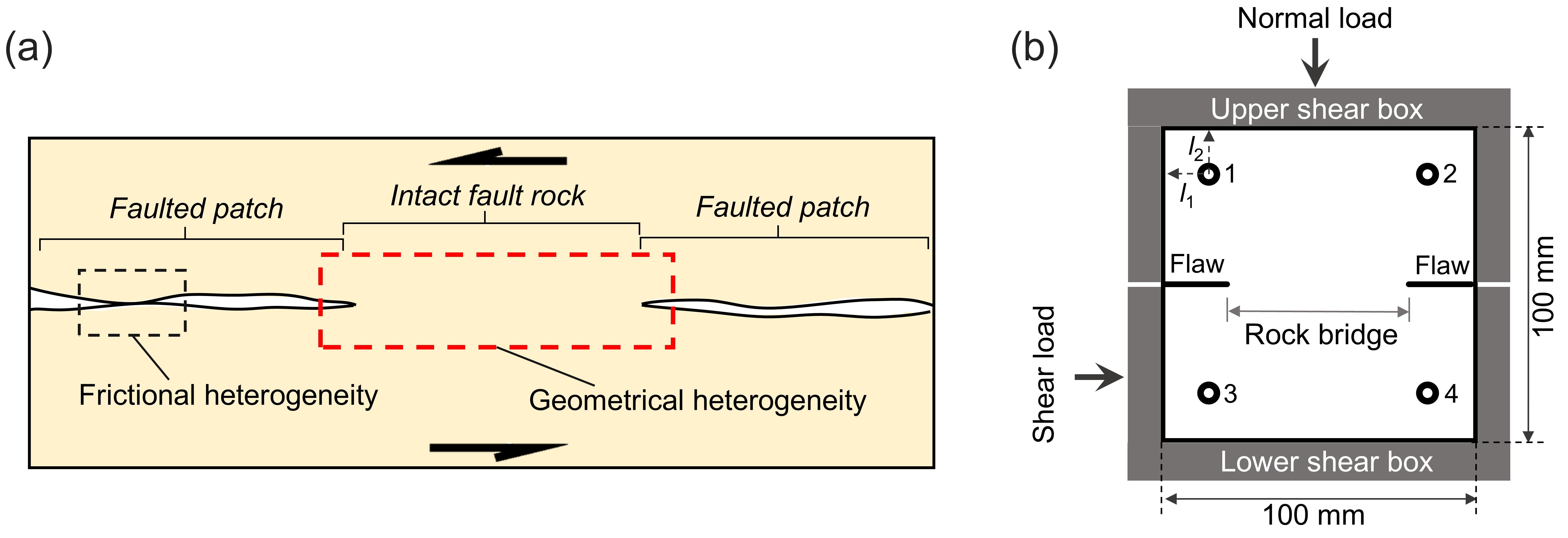图1 (a)天然断层非均质性;(b)实验室非贯通断层剪切试验