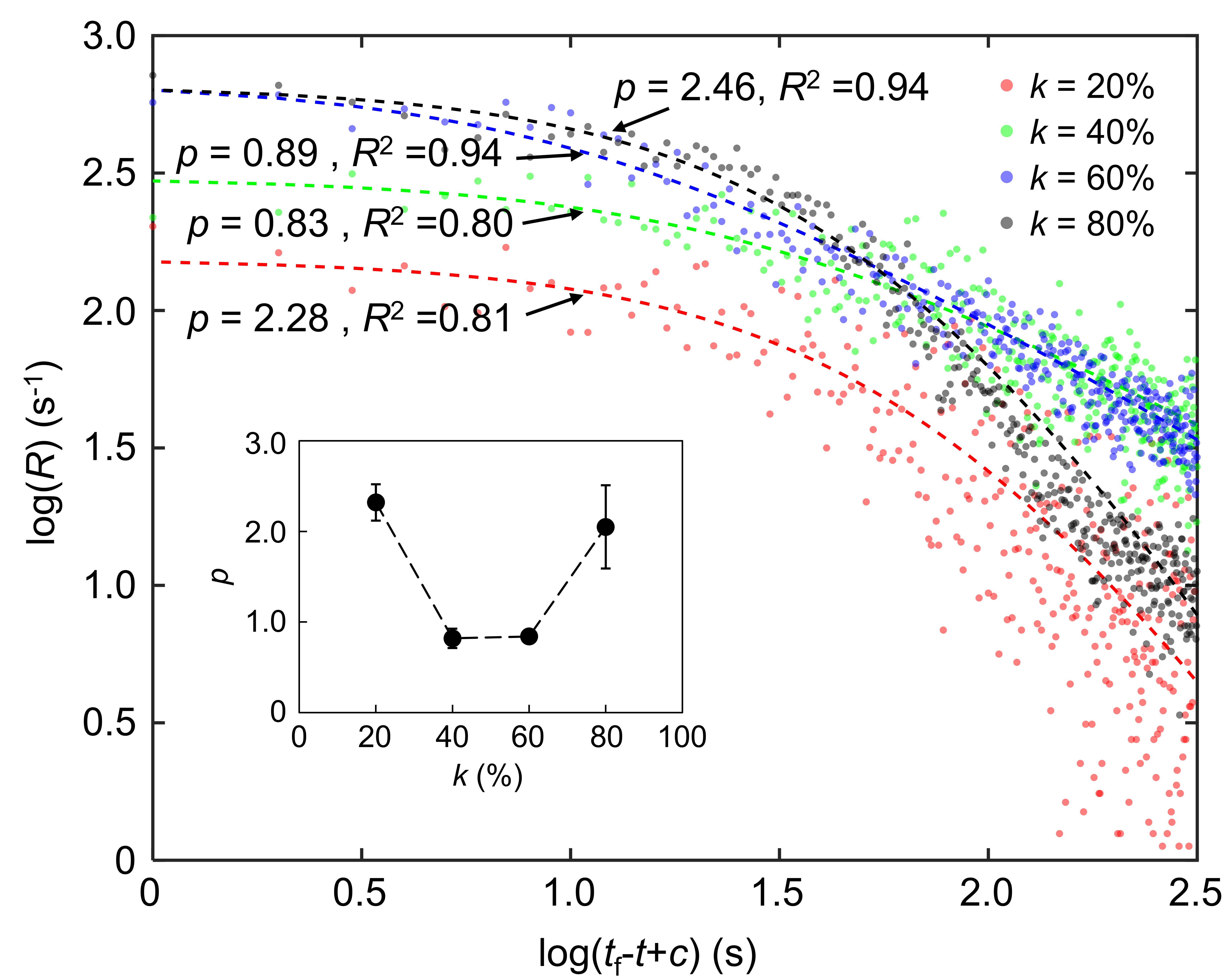 图5 不同尺寸岩桥破坏前声发射事件增加的快慢比较(p值)