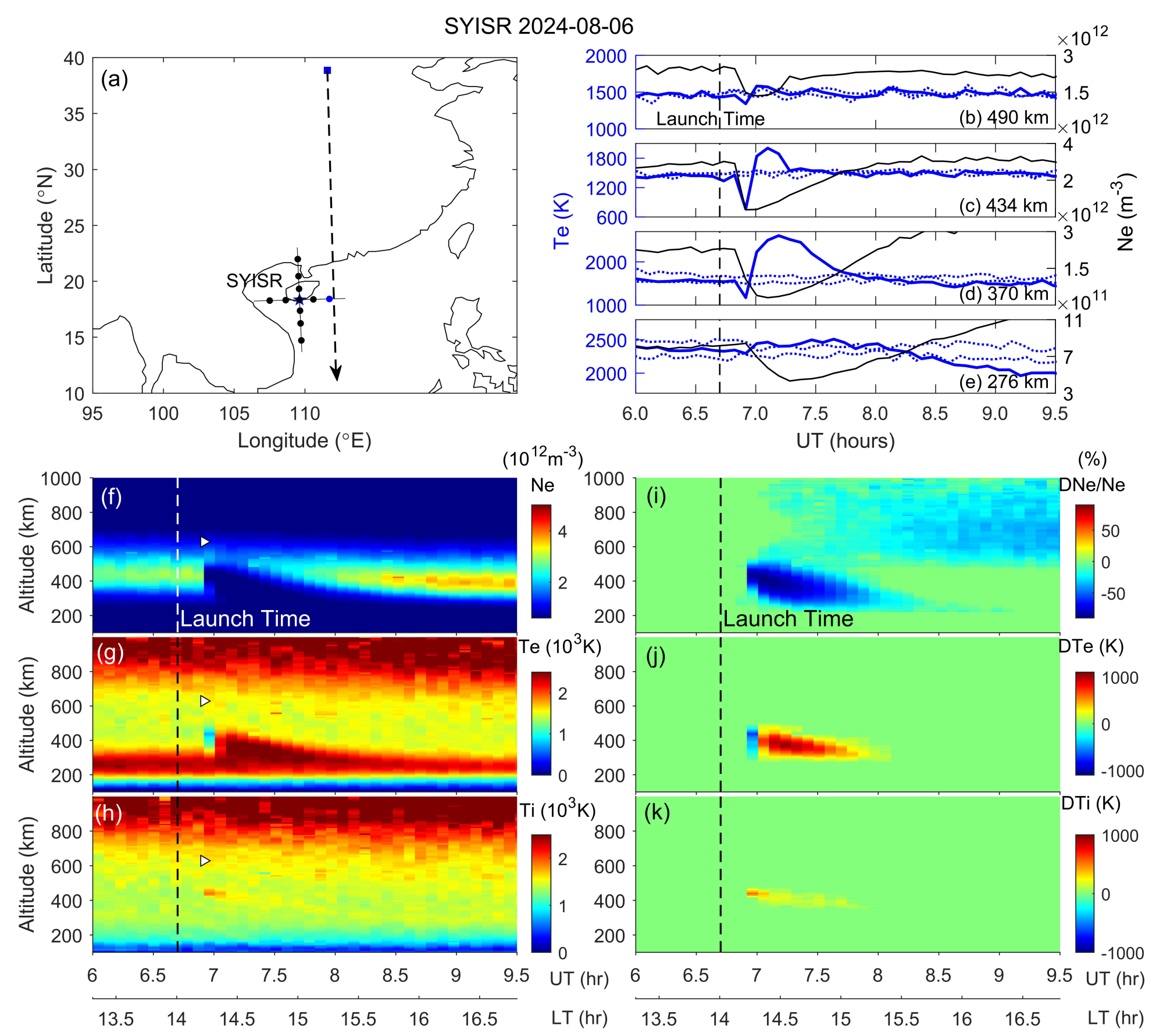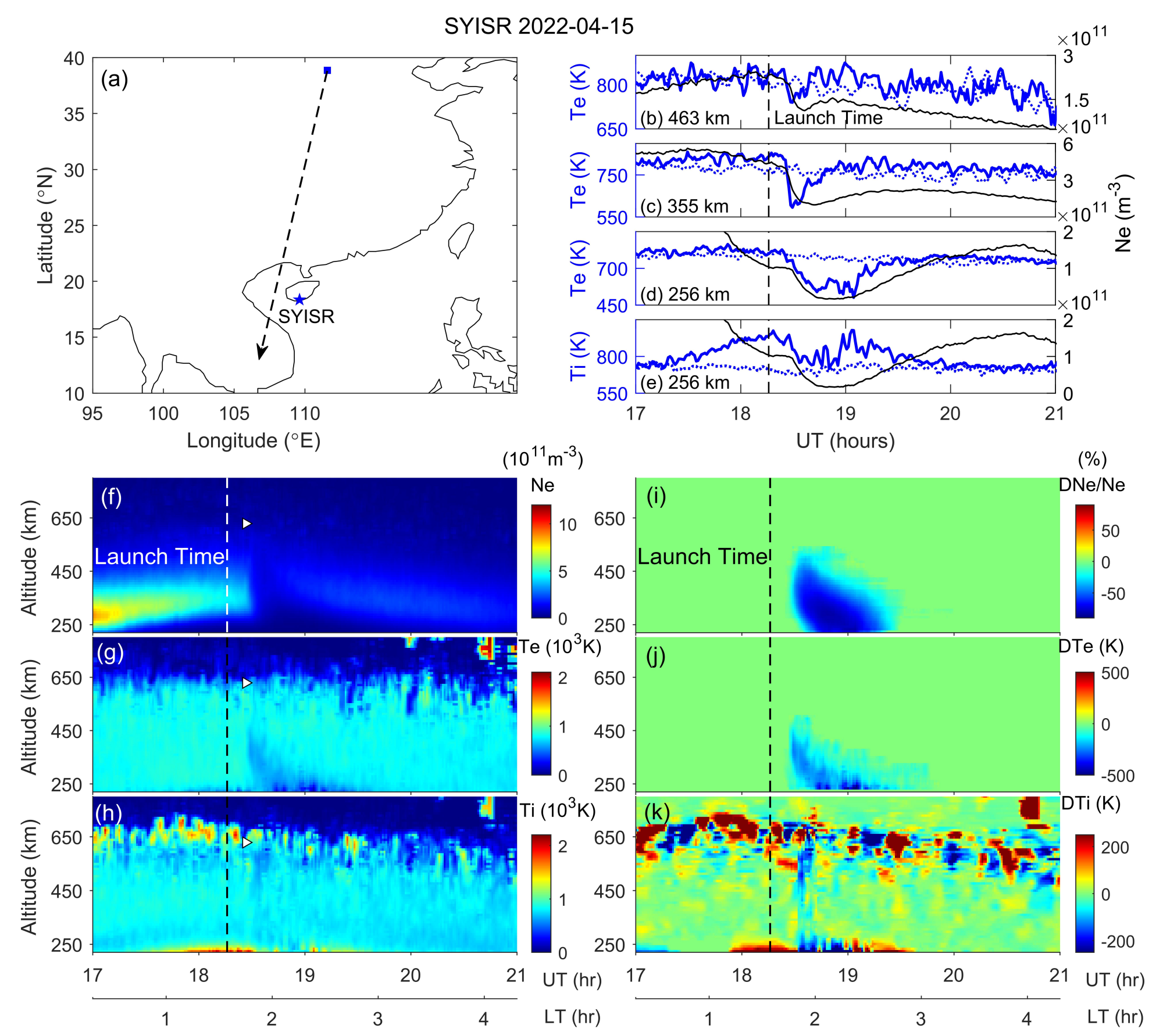 图1 夜间发射的火箭过境期间,SYISR观测到的电离层电子密度(Ne)、电子温度(Te) 和离子温度(Ti) 变化情况。(a) 火箭轨迹的水平投影(黑色虚线);(b~e) 火箭过境期间,Ne时间序列(黑色实线),以及相同时段的发射日(蓝色实线)和无发射日(蓝色虚线)的Te/Ti的变化时序;(f~h) Ne、Te和Ti的变化与(i~k) 扰动的变化。白色三角形标注了估计的火箭过境时间与高度