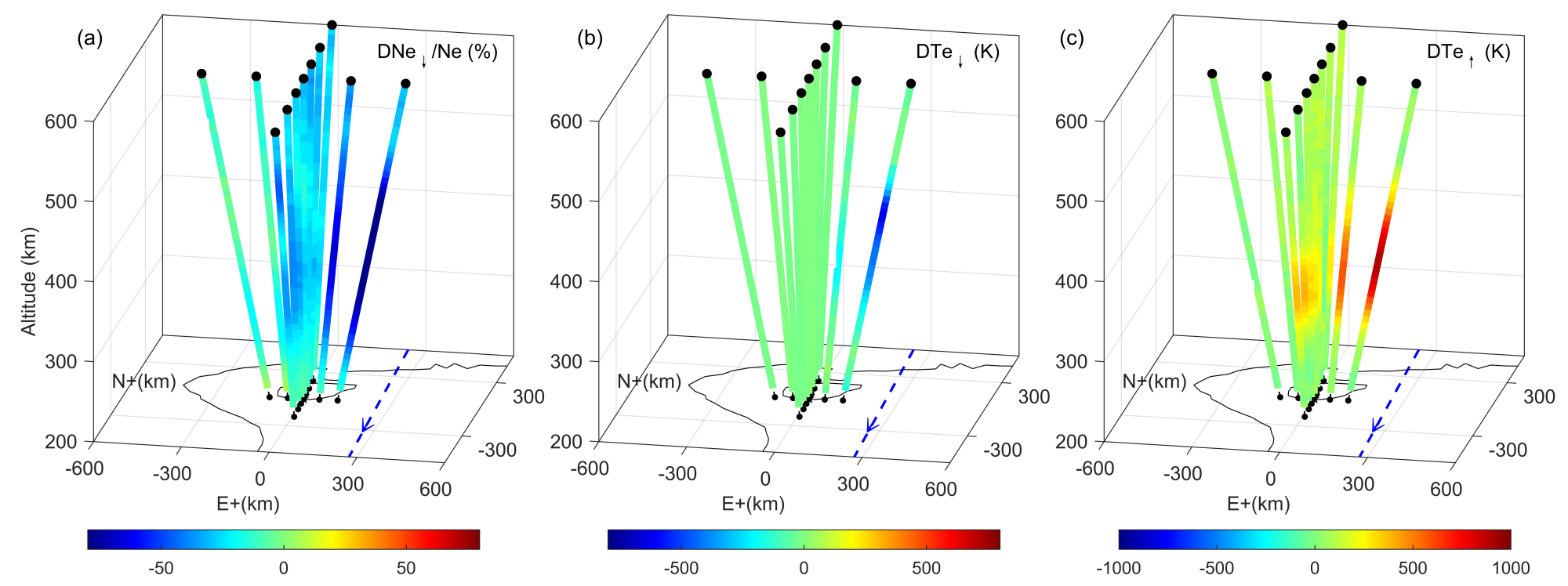 图3 日间发射的火箭过境期间,SYISR多波束模式观测到的Ne相对下降(a)、Te绝对下降(b)和Te绝对上升(c)幅度的三维变化特征。各子图中波束上的颜色代表火箭过境期间,波束对应位置上观测到的Ne和Te上升或下降的最大幅度。黑色圆点代表11个波束上200 km和600 km高度的位置,蓝色虚线为火箭飞行轨迹的地面投影
