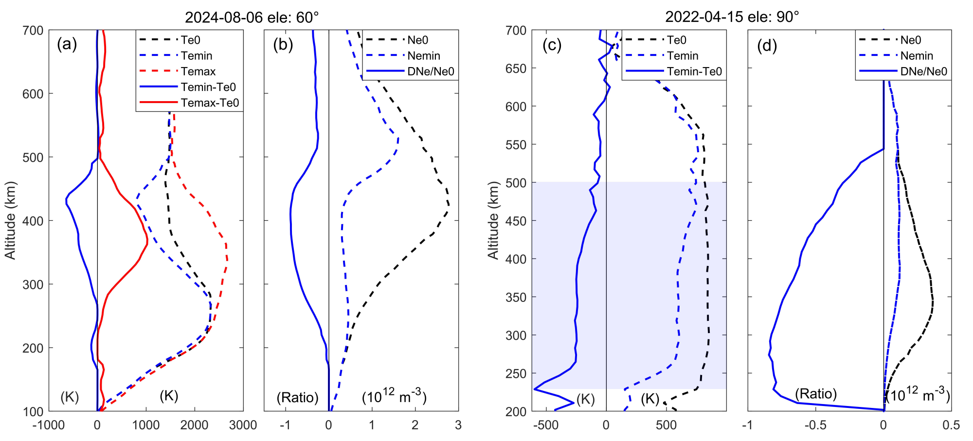 图4 Te与Ne扰动的极值(Temin - Te0, Temax - Te0, DNe/Ne0),以及其背景值(通过对观测时序滤波获得,Te0, Ne0)和极值时刻的观测值(Temin,Temax, Nemin)。(a, b)日间扰动;(c, d) 夜间扰动。蓝色阴影区域对应图1j中Te下降的高度区间,超出该区域,Te扰动被观测噪声掩盖